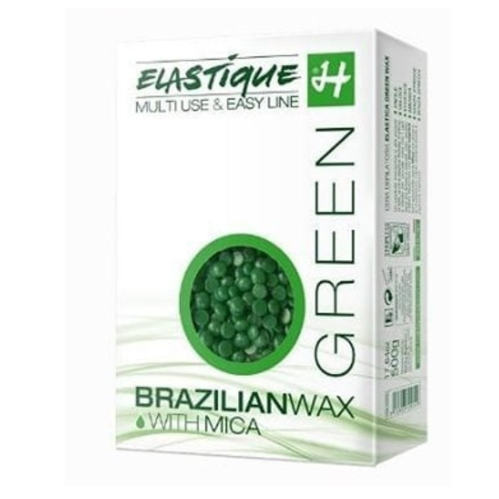 Striploze elastische Brazilian hars in groen voor normale huid. Verkrijgbaar in 400 ml, 500 ml en 500 g parels. Lang houdbaar en geschikt voor elk type haar