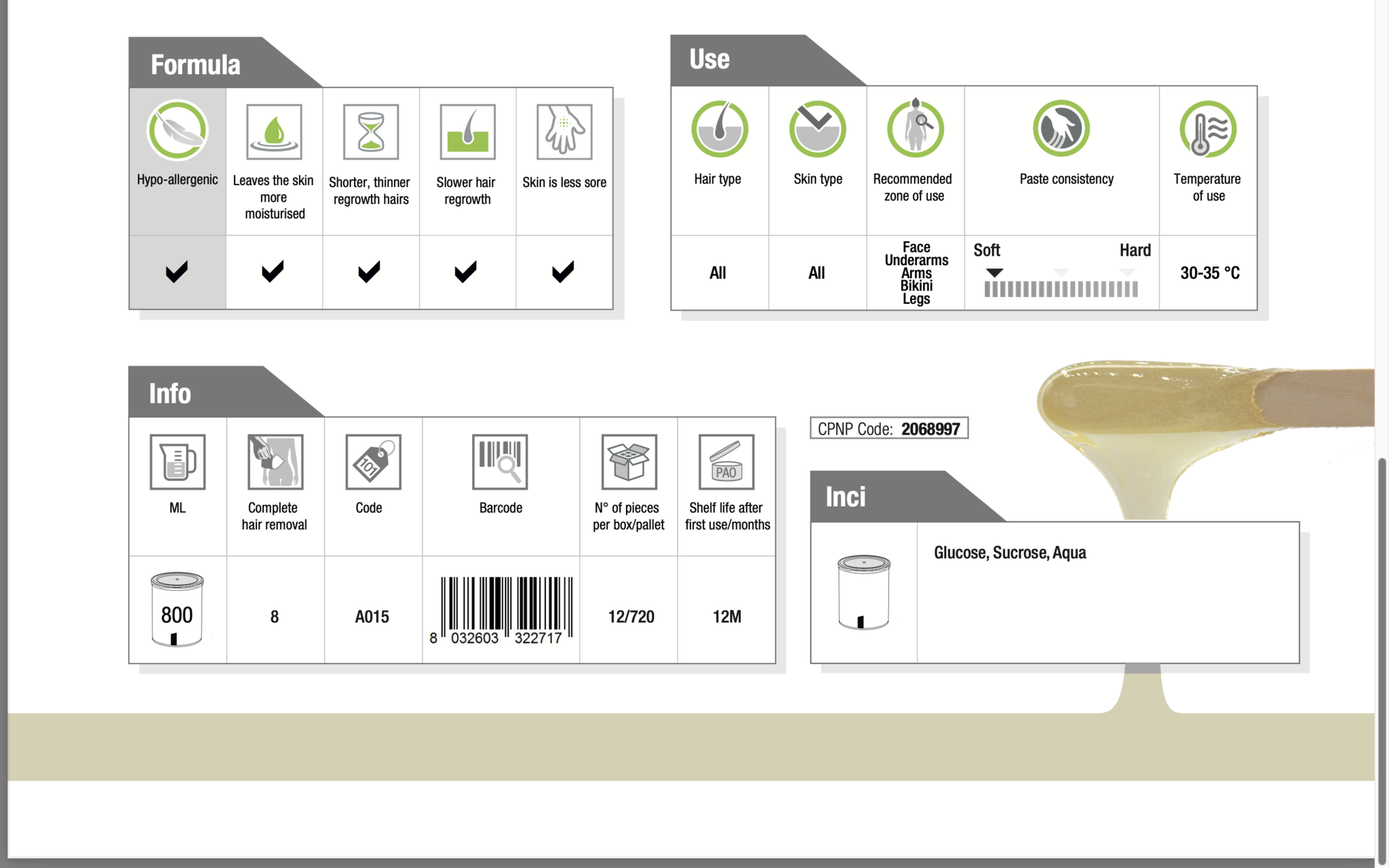 Deze sugarpaste hecht zich aan de haren – niet aan de huid – en verwijdert zelfs korte haartjes doeltreffend. Ideaal voor gezicht, oksels, bikinilijn, armen en benen. De zachte samenstelling maakt dit product ook geschikt voor klanten met een gevoelige of snel geïrriteerde huid.